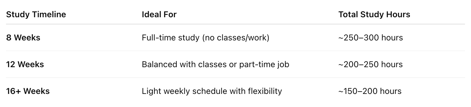 Most students need 8–12 weeks of focused study time — though if you’re balancing work or school, 3–4 months may be ideal.