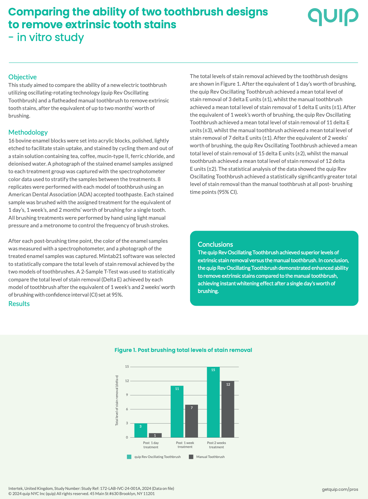 At every time point—1 day, 1 week, and 2 weeks—the quip Rev Oscillating Toothbrush removed more stain than the manual toothbrush. The difference was statistically significant at all time points.