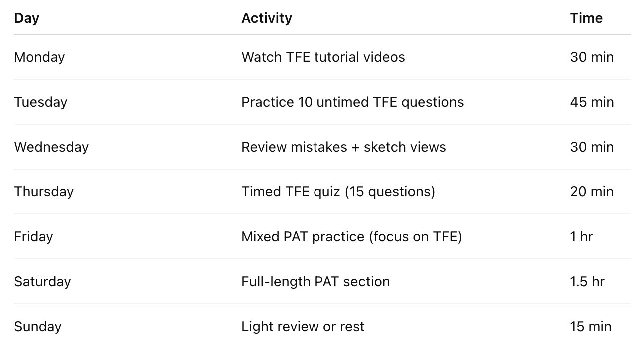 TFE might feel overwhelming at first, but like any other PAT section, it's a learnable skill. With the right strategy, consistent practice, and visualization training, you'll be amazed at how much progress you can make—even in just a few weeks.